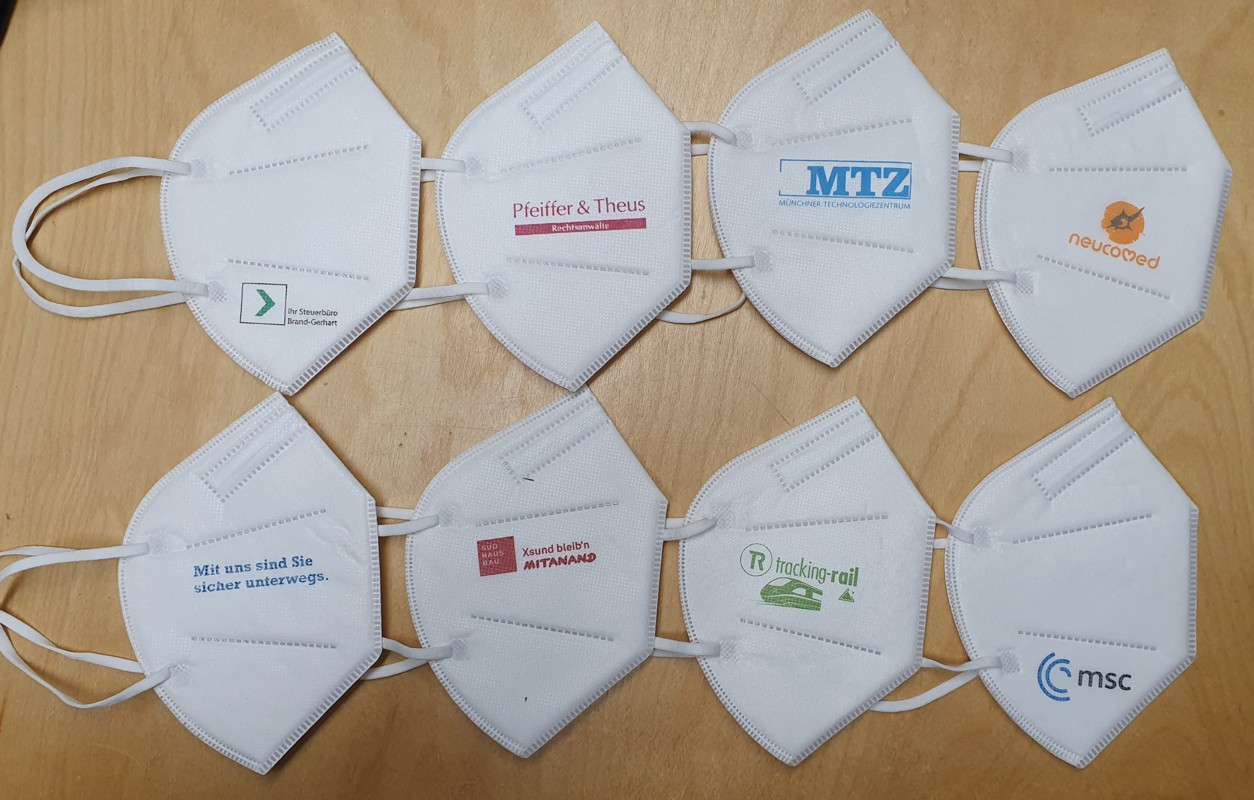 Hier ein paar Beispiele von bedruckten “weißen” FFP2 Masken mit Logos: