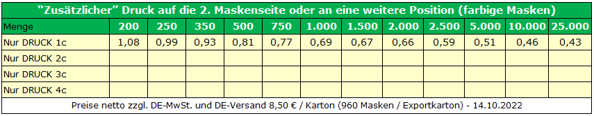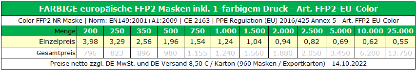Freibleibende Preislisten FFP2-EU-Color Masken inkl. Druck auf “farbige” Masken: