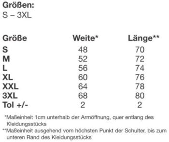 Das Poloshirt gibt es in einer großen Auswahl an Textilgrößen. Hierzu finden Sie auch die Maße für Weite und Länge der jeweiligen Poloshirt Größe.