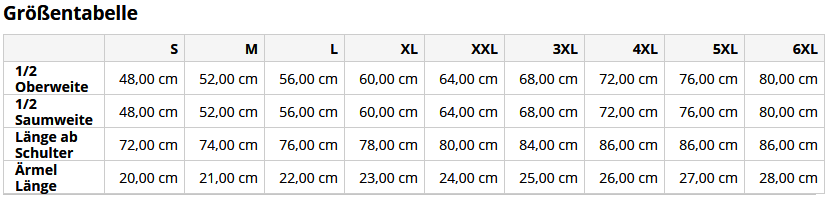 S | M | L | XL | XXL | 3XL | (auch 4XL, 5XL und 6XL verfügbar)