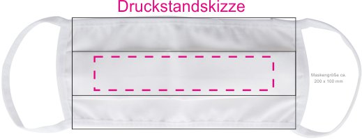 - Werbeanbringung: die Mund-Nasen-Schutz Masken bedrucken wir im Transferdruck mit Ihrem Logo mit bis zu 4 Siebdruckfarben / auch 4c CMYK (4c-farbig im Preis inkl.)
