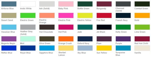 Airforce Blue | Arctic White | Ash (Solid) | Baby Pink | Bottle Green | Burgundy | Charcoal (Solid) | Combat Green | Desert Sand | Electric Green | Electric Orange | Electric Pink | Electric Yellow | Fire Red | French Navy | Gold | Hawaiian Blue | Heather Grey (meliert) | Hot Chocolate | Hot Pink | Jade | Jet Black | Kelly Green | Lime Green | Magenta Magic | Mint | Olive Green | Orange Crush | Oxford Navy | Plum | Purple | Red Hot Chilli | Reflex Blue | Royal Blue | Sapphire Blue | Sherbet Lemon | Sky Blue | Sun Yellow | Turquoise Blue | Vanilla