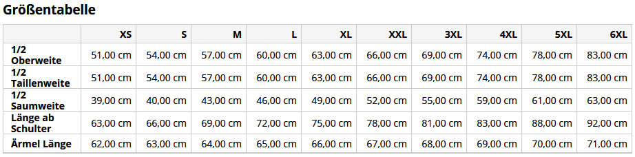 Hier finden Sie die Übersicht über alle Konfektionsgrößen des Sweatshirts / Pullovers
